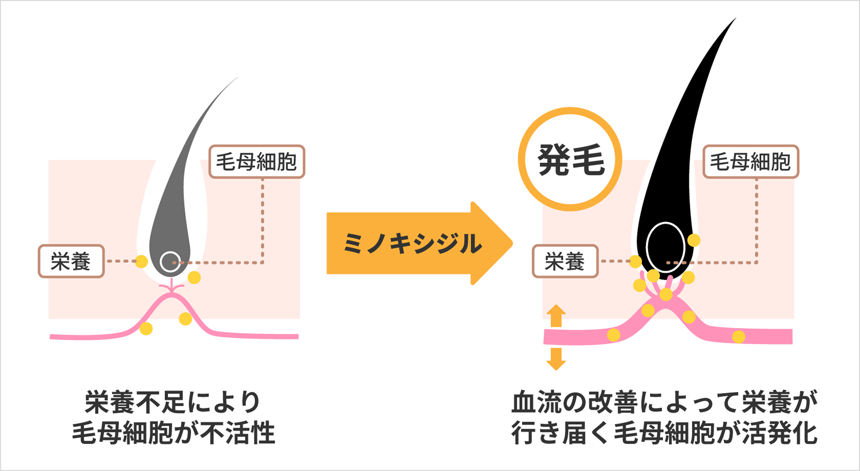 ミノキシジルには血管を広げることで血流を良くする作用があります。AGA患者がミノキシジルを使用すると髪の毛を作る毛乳頭細胞に栄養が行き渡るため、健康的な髪の毛が作られます。また、毛包を活性化させる働きもあるため発毛が促進されるのです。