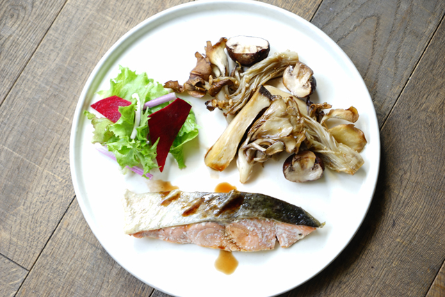 美肌作用のあるビタミンB群の多いキノコと、抗酸化作用を持つアスタキサンチン豊富な秋鮭のグリルをご紹介。
