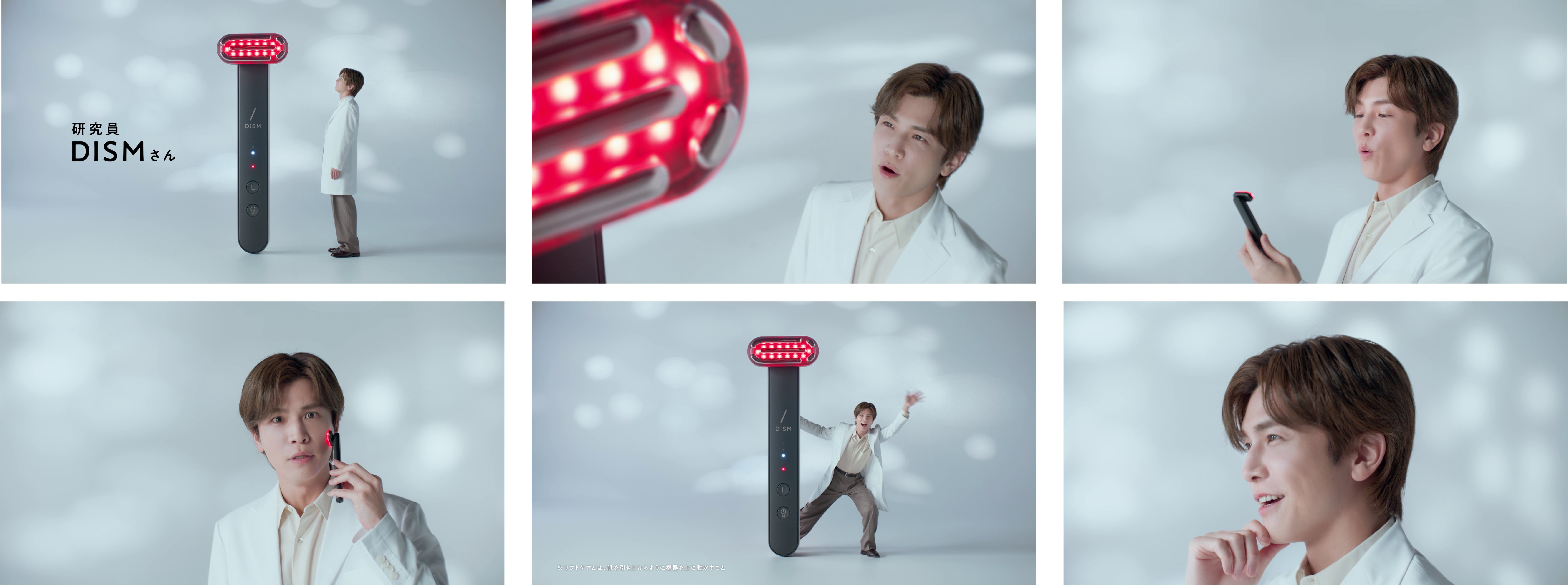 「ディズム 美顔器 研究篇」 では、巨大な美顔器を惚れ惚れと見上げながら「ワオ」とつぶやき、「お~、コンパクト…なのにパワフル!?」と、自分のアイデアに改めて驚いた様子。大きく手を振りながら嬉しそうに美顔器のまわりで一生懸命にアピールする姿から、美顔器の出来栄えに対する興奮も伝わります。「ディズム 白泡洗顔 飛び出る篇」 では、洗顔ボトルからひょっこり顔を出したDISMさんが「成功しちゃった」とお茶目に小声で一言。たっぷりな泡で満足げに洗顔したり、抱き着いたりと、可愛らしい様子が描かれます。